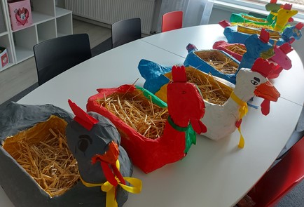 Hühner im Hof Immmer wieder staunen und freuen wir uns über die schönen krativen Bastelideen der Gruppen. Und das waren auch sehr besondere gebastelte Hühner, nicht nur dass sie im Garten unterwegs waren, sie hatten auch noch leckere Osternaschereien dabei. zurück